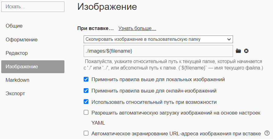 Это позволит копировать изображения в связанную папку локально. Для переноса картинки из временной папки в постоянную, используйте контекстное меню на картинке Скопировать в <папка>..., где папка - это имя папки, совпадающее в названием документа (создается автоматически при первом сохранении документа).