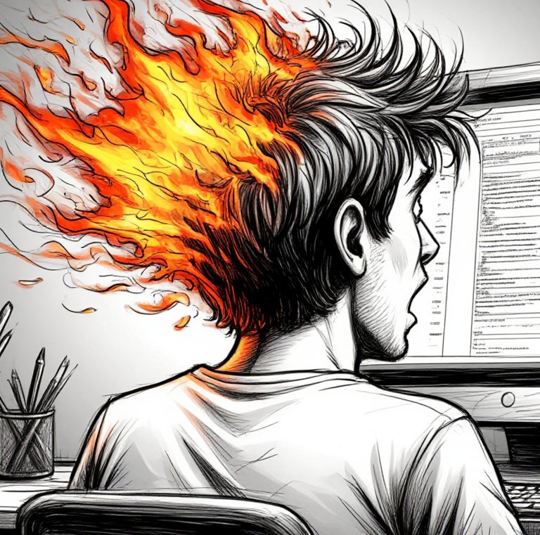 画像は、頭が炎で燃えている人物がコンピューターの前で、おそらく疲弊して作業している様子を示しています。(AIによる画像のキャプション)